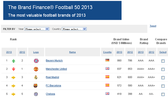 足坛品牌价值榜:拜仁超曼联居榜首 多特位居第十