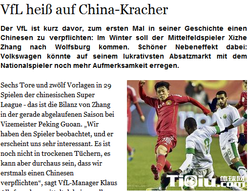 国际足球 时间:2014-11-12 11:23来源:未知编辑:小北【导读】北京时间2014年11月12日消息,本赛季中超联赛已经落幕,但是中国球员张稀哲成为了热门话题。最近有不少消息称北京国安中场球员张稀哲可能在今年冬季登陆欧洲联赛,而最有可能的去向则是德甲劲旅沃尔夫斯堡。据媒体的消息称,最近张稀哲正在努力学习德语,为出国踢球做着准备。而在接受采访的时候张稀哲也自曝已经和沃尔夫斯堡方面接触了一年的时间,很期待代表沃尔夫斯堡对阵拜仁的较量。近日沃尔夫斯堡当地媒体《沃尔夫斯堡汇报》更是信誓旦旦的表示,俱乐部将要迎来队史的第一名中国球员:张稀哲!