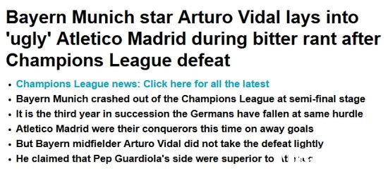 在安联球场,拜仁占据了72%的控球率,但仍无法拿下足以晋级的比分。比达尔说:“这一次,丑陋足球---马德里竞技----面对世界上最好的足球。他们唯一能摸到球的时候,就是那个进球而已。”