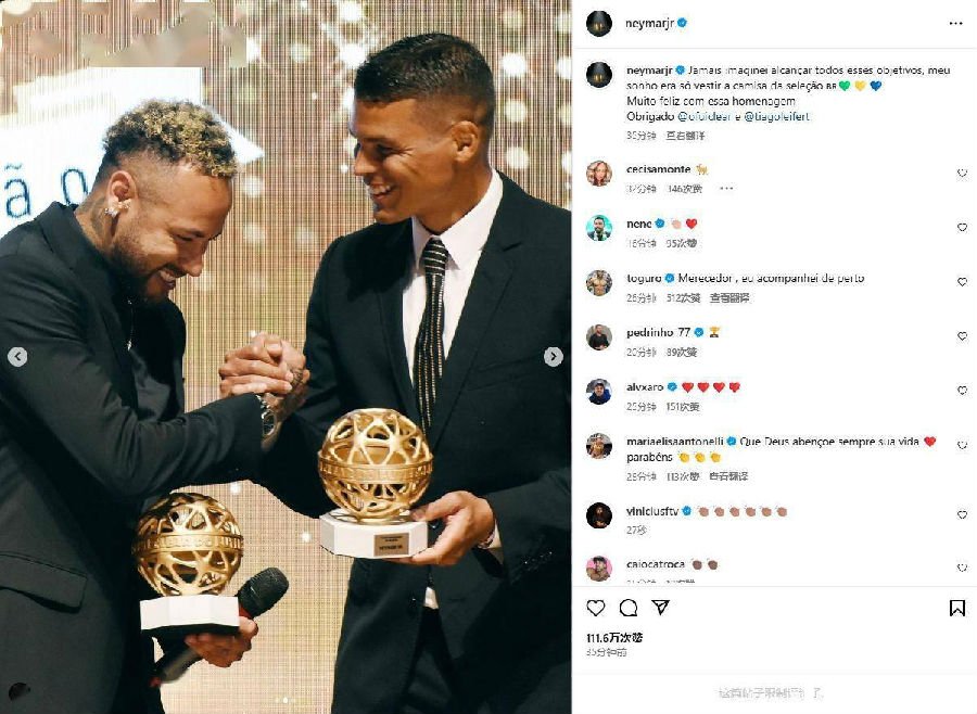 内马尔在社媒写道:“说实话我从来没有想过能实现这些目标,一直以来我的梦想只是身穿巴西队战袍,为国征战。能够获得这个奖项的认可,我非常高兴。”