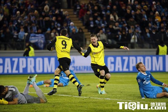 国际足球 时间:2014-02-26 11:08来源:http://gjzq.tiqiu.com编辑:小伍哥【导读】北京时间2月26日凌晨01点00分,2013-14欧冠1/8淘汰赛首回合一次比赛,客场作战的多特蒙德4-2大胜泽尼特。上半时,姆希塔良首开纪录,罗伊斯再下一城。下半时,泽尼特由沙托夫的补射和胡尔克的点球两度将比分缩小,但莱万多夫斯基的梅开二度彻底锁定比赛。