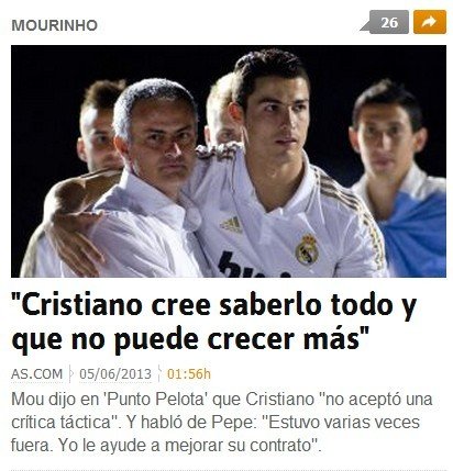 北京时间6月5日,据西班牙《阿斯报》最新报道,已经在切尔西上任的穆里尼奥接受《点球点》电视节目的采访时,谈到了很多和皇马有关的话题,说到昔日的爱将C罗,穆帅暗批后者狂妄自大,不服从战术安排,认为教练已经不足以帮助他成长。