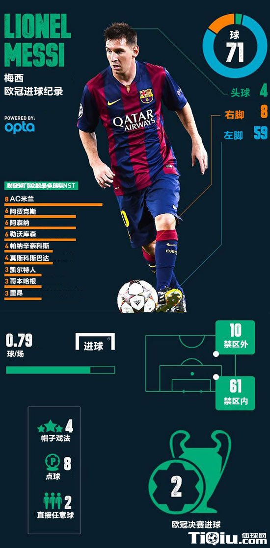 ·梅西71粒欧冠进球当中有4粒头球进球,8粒右脚进球,59粒左脚进球·梅西8次攻破AC米兰的大门,是个人进球最多的欧冠对手;其次是阿贾克斯、阿森纳、勒沃库森,都分别对他们打进6球。