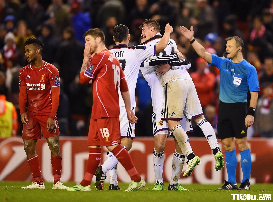 失落的利物浦队员身后,是肆意庆祝的巴塞尔队员