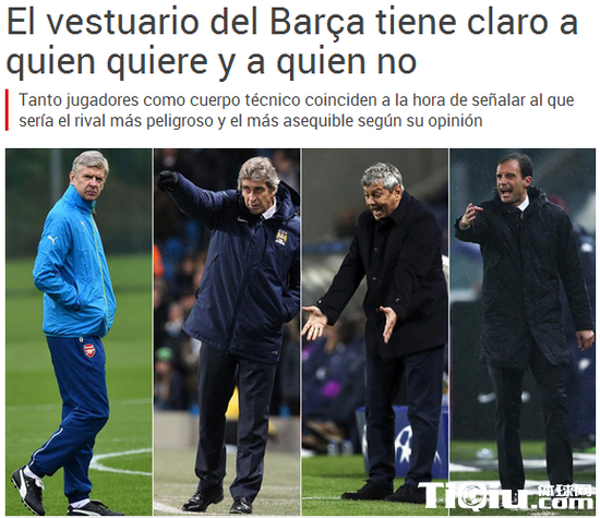 国际足球 时间:2014-12-12 15:16来源:未知编辑:小北【导读】北京时间2014年12月12日消息,北京时间下周一19点,欧冠1/8决赛抽签将会正式进行,16强球队都将知晓自己的下一个对手。巴萨球员最想抽到谁最不想抽到谁?《每日体育报》进行了揭秘。巴萨球员最想抽到的是巴塞尔,最不想抽到的是尤文。