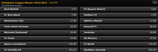 皇马和拜仁是最被看好的两大豪门,皇马和拜仁的1/8决赛对手实力有限,因此两队相比小组赛结束后,赔率更低。在小组赛结束后两队的夺冠赔率都为1赔4(威廉希尔),而在1/8决赛对手确定后,赔率降低至1赔3.5(威廉希尔)。Bwin更是把皇马作为唯一的最大热门,皇马1赔3.75(Bwin)的赔率领先拜仁(1赔4)一筹。反观巴萨却因为对阵强敌曼城,从之前的1赔5.5赔率升至1赔6(威廉希尔),曼城也从1赔13升至1赔15(威廉希尔)。