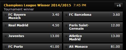 国际足球 时间:2015-03-19 13:43来源:未知编辑:小北【导读】北京时间2015年3月19日消息,在今天凌晨进行的两场欧冠1/8决赛次回合比赛中,巴萨主场1-0小胜曼城、尤文客场3-0战胜多特蒙德,这样本赛季的欧冠八强已经全部产生。他们是西甲的皇马、巴萨、马竞,法甲的巴黎圣日耳曼、摩纳哥,意甲的尤文,德甲的拜仁,葡超的波尔图。而在八强确定后,欧冠夺冠赔率也有了最新的调整。