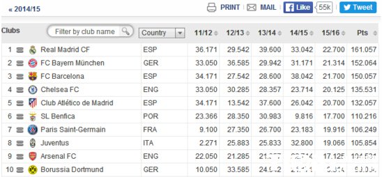 另外,有着“欧联杯盟主”之霸气外号的塞维利亚则排在第19;而曼彻斯特双雄也都排在了10名以外,其中曼城排名第14,而曼联更是仅仅排名第20,不及那不勒斯、波尔图这样的欧洲二线球队。