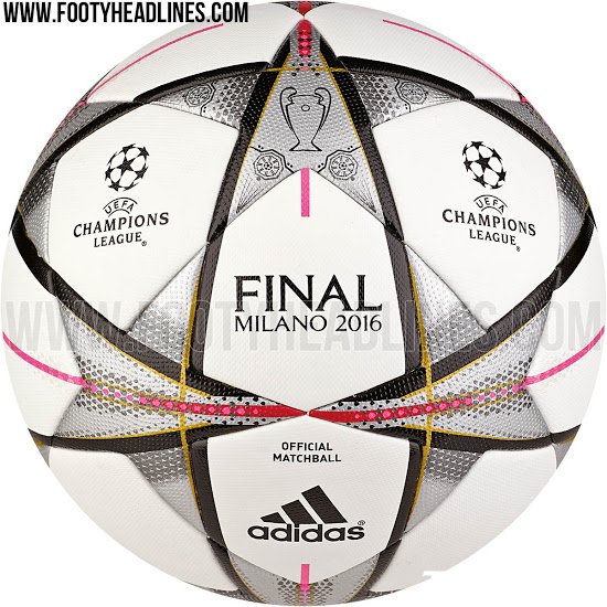 2016欧冠决赛用球设计则相对简单,银色和黑色交织的五星图案与白色色块相拼接,居中的银色五星上印有欧冠大耳朵杯和齿轮图案。此外还印有欧洲冠军联赛官方标识和2016米兰决赛字样,款式大方简洁。