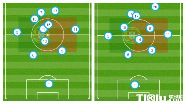 ( 对阵冰岛(左)和奥地利(右)葡萄牙球员的平均位置)