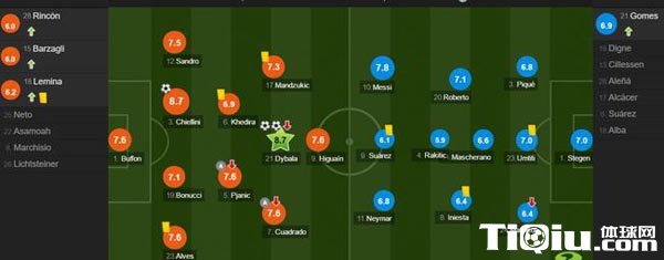 尤文图斯(4-2-3-1):1-布冯/23-阿尔维斯,19-博努奇,3-基耶利尼,12-阿莱士-桑德罗/6-赫迪拉,5-皮亚尼奇(89‘15-巴尔扎利)/7-夸德拉多(73’勒米纳),21-迪巴拉(81‘林孔),17-曼朱基奇/9-伊瓜因(未出场替补:25-内托,8-马尔基西奥,22-阿萨莫阿,26-利希施泰纳)