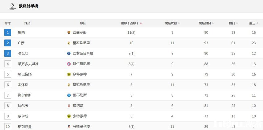 欧冠2016-2017射手榜 2017欧冠射手排名