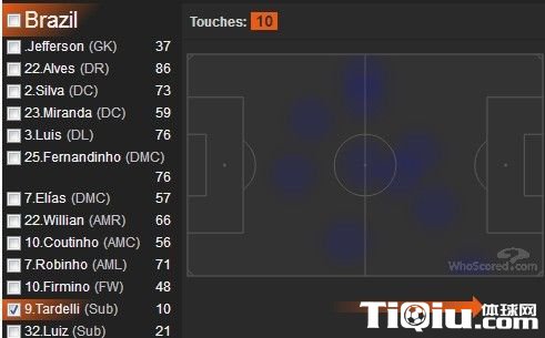 中国球迷关注的山东鲁能前锋塔尔德利,得到25分钟替补出场时间。最后时刻巴西收起进攻,塔神这25分钟,属于真正意义上的打酱油。OPTA数据显示,塔尔德利25分钟7次传球,10次触球,分布在中圈区域(如蓝色图所示)。塔尔德利0射门,0威胁传球,0过人,0被侵犯,还有1次控球失误被抢断。塔神很好的扮演了“防守型前锋”的角色,贡献两次抢断,还有1次犯规。不过,把巴西9号踢到这种境界,塔神也算是前无古人了。