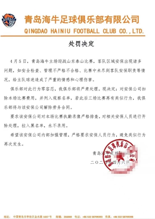 4月6日下午,一份印有青岛海牛足球俱乐部有限公司公章的“处罚决定”在网络中流传。随后,海牛官方工作人员证实了文件的真实性。由于客队区域安保出现诸多问题,海牛俱乐部决定对安保公司扣除本场比赛的费用,并列入观察名单。 4月5日晚,青岛海牛0:1不敌山东泰山队,共有超过5000名泰山队球迷在客队区为泰山队加油助威。...