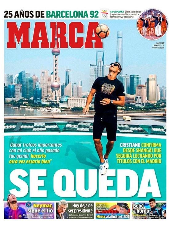 “上赛季,我在俱乐部赢得了不少重要奖杯。这种感觉非常棒,如果能在新赛季重来一番的话,那可就太好了。”C罗的这番话,被《马卡报》解读为葡萄牙人变相宣布留队。在对自己的未来新闻沉默之后,C罗这番话是最接近于明确表态的说法。
