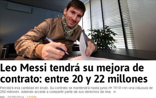 据《阿斯报》先前消息,梅西将与巴萨续约一年。然而根据最新消息,梅西合同依然会在2018年6月30日到期,而合同中规定2.5亿欧元违约金数额没有变化。梅西的年薪却有大幅提升,由1600万欧元涨至2000万-2200万欧元之间,梅西的年薪将铁定超过C罗的1700万欧元,同时超过鲁尼的1880万欧元,使得阿根廷巨星成为世界上工资最高的足球运动员。