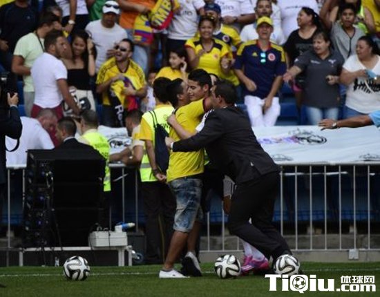J罗现身伯纳乌的草皮上,颠球秀球技,时而不忘亲吻胸前的队徽,伯纳乌的欢呼声此起彼伏。可是就在这时,却发生一件意想不到的事情,一位身穿哥伦比亚球衣的狂热球迷冲进球场,试图拥抱皇马8000万先生,可惜他不太走运,瞬间就被数名保安将其制服,强行把他拖走。