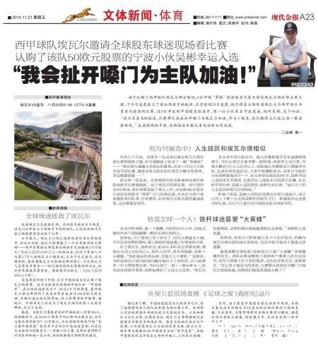 国际足球 时间:2014-11-21 15:51来源:未知编辑:小北【导读】北京时间2014年11月21日消息,由于认购了西甲球队埃瓦尔部分股份,5位中国“草根”球迷股东代表日前受埃瓦尔俱乐部主席之邀,于今日凌晨搭上了前往西班牙的航班。北京时间23日凌晨,他们将在主场观看埃瓦尔与西甲豪门皇家马德里的比赛。这5位幸运的中国股东球迷中,有一位小伙来自宁波慈溪,他叫吴彬,是个90后。“我不是皇马的球迷,比赛那天我会扯开嗓门为埃瓦尔加油,作为小股东,我们期待主队能上演一幕逆袭好戏。”
