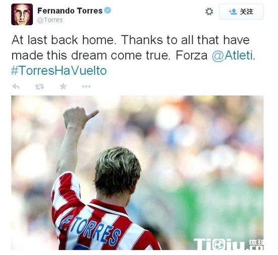 托雷斯写道:“终于回家了,感谢那些让我梦想成真的人们。”然后还@了马竞官方的推特账号。托雷斯回归马竞,离不开AC米兰俱乐部丛中斡旋,切尔西大度放人,以及作为添头的马竞边锋切尔奇最终选择加盟米兰。这场一波三折的转会剧在今天终于迎来大结局。