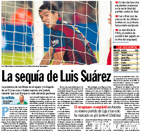 国际足球 时间:2015-01-08 10:43来源:未知编辑:小北【导读】北京时间2015年1月8日消息,近来由于巴萨出现更衣室危机,西班牙媒体的关注焦点都放在了梅西身上。但在更衣室风暴之外,苏亚雷斯的糟糕状态也值得大批特批。《每日体育报》今天就指出,单从数据上来看的话,苏亚雷斯已经成了巴萨本世纪表现最差的新援中锋!