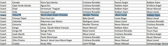 作为中国队队长,张琳芃选票的顺位是C罗、梅西和穆勒。中国队主教练佩兰则是穆勒、梅西和罗本,C罗根本没有出现在选票当众。《体坛周报》的选票顺序是C罗、诺伊尔、穆勒,梅西则没有入选。