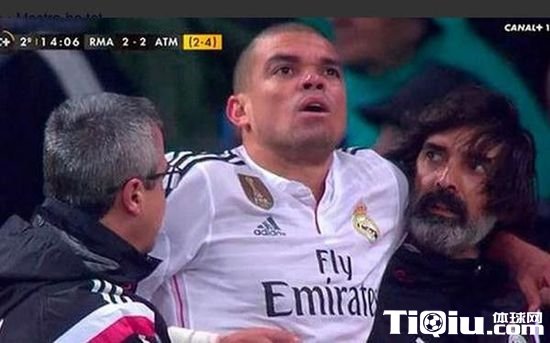 两次失误导致丢球不说,佩佩还在比赛终负伤离场。第58分钟,马竞获得任意球机会,科克右路传中,西班牙国脚劳尔-加西亚和佩佩纠缠在一起,乱战中,猛冲的加西亚从侧身后和佩佩相撞,看上去是佩佩肘击了加西亚,但马竞队长没事,佩佩却捂住右肋部倒在地上,表情极为痛苦。队医马上进场观察,佩佩无法继续坚持比赛,被队医搀扶着走下场。皇马用瓦拉内换下佩佩,走过场边时,马竞主帅西蒙尼还摸了佩佩的头以示安慰。