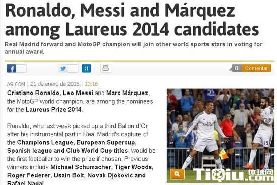 国际足球 时间:2015-01-22 14:22来源:未知编辑:小北【导读】北京时间2015年1月22日消息,劳伦斯奖,创立于2000年,是世界范围内唯一的全球性颁奖典礼。2015年4月15日,劳伦斯奖将会在上海颁发2014年的各大奖项。C罗和梅西都入选了年度最佳运动员的初选名单,皇马获得最佳球队提名,J罗则获得了最佳新人提名。