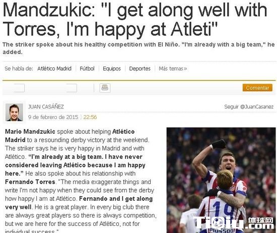 国际足球 时间:2015-02-10 11:49来源:未知编辑:小北【导读】北京时间2015年2月10日消息,据西班牙《阿斯报》消息,马竞锋霸曼祖基奇接受了采访,他辟谣了离队传言,坦承会长期留在马竞,而对于托雷斯,他进行了一番盛赞。目前欧冠淘汰赛将在下周开打,马竞主席塞雷佐豪言球队要再次闯入欧冠决赛。