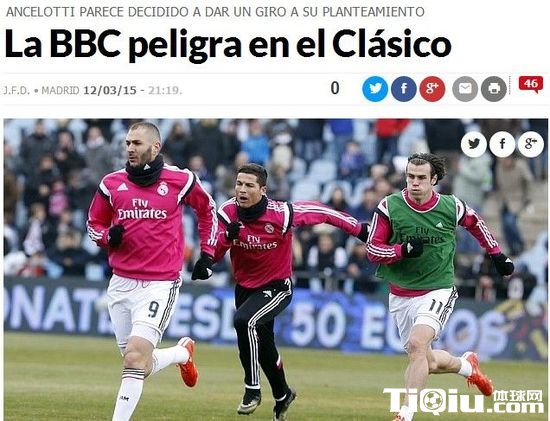 国际足球 时间:2015-03-13 11:28来源:未知编辑:小北【导读】北京时间2015年3月13日消息,无数次宣称“坚持433不动摇,坚持BBC不动摇”的安切洛蒂,现在终于要有所改变了。《马卡报》今天指出,BBC三叉戟将很难在国家德比中联袂首发。在诺坎普,安切洛蒂很有可能将阵型调整为442。