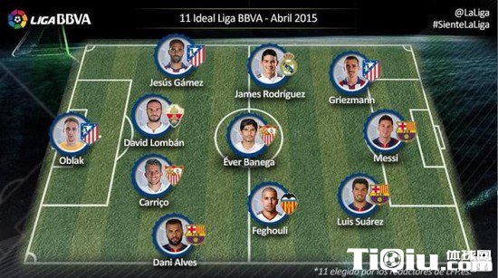 西甲四月最佳阵容 梅西J罗领衔C罗落选