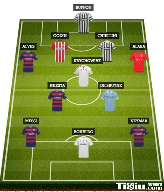 西甲球队几乎统治这份名单,有多达7名来自西甲的球员。除了皇马、巴萨的球员以外,马竞的戈丁以及塞维利亚的科里乔维亚克也获得认可。剩余4个位置则分别属于:尤文图斯的布冯以及基耶利尼,曼城的德布劳内,拜仁的阿拉巴。