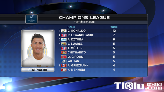 组赛结束后,C罗本赛季的欧冠进球数就超过了整个上赛季的欧冠进球数,现在他的挑战是打破自己创造的欧冠单赛季17球的纪录。葡萄牙人创造了一系列漂亮数据,过去4个赛季,他已经取得了50个欧冠进球,比第二名的球员多21个。