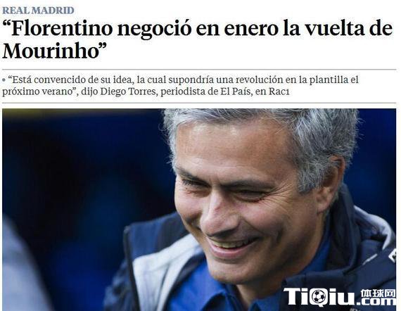 迭戈-托雷斯透露,弗洛伦蒂诺现在的想法就是“不惜一切代价请回穆里尼奥”,“弗洛伦蒂诺是如此确信,他将迎回穆里尼奥视为自己的理想和前进方向,他相信皇马能请回穆里尼奥。整个一月份,弗洛伦蒂诺都在与穆里尼奥谈判,以期在今夏招回葡萄牙教练,这将是对皇马阵容的一大革命。”
