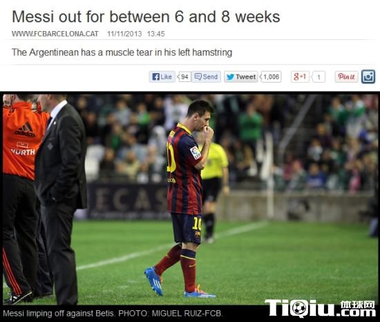 国际足球 时间:2013-11-12 09:17来源:http://gjzq.tiqiu.com编辑:后青【导读】北京时间11月11日晚,巴塞罗那俱乐部在其官方网站上宣布,梅西左大腿二头肌撕裂需要休战6-8周。如果不能提前复出的话,这也就以为这梅西的2013年已经提前结束。