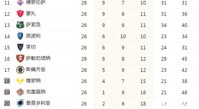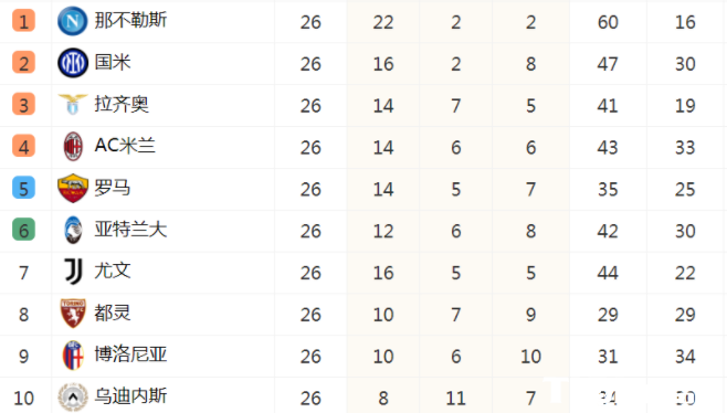 意甲积分榜排名一览: