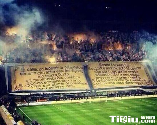 在上周对阵那不勒斯的比赛中,梅阿查北看台再度出现震撼人心的助威墙,球迷于巨型书卷上写到:“没有球迷们的加油呼喊,没有公众活动,足球什么都不是。足球是一段激情的历史,而且他会一直如此。没有激情,足球便会死亡,没有激情,足球在人看来就是22个人在追逐一个皮球,这样的足球就是狗屁一般,那些禁令就是要把足球变成这样。”北看台正向意大利体育法庭宣战,最终结果则是北看台再次吃到封闭的禁令。