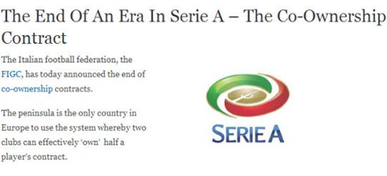 意大利足球自从当年无限风光的“小世界杯”沦落到现今的黯淡,其中有着多方面的因素。曾经遥遥领先的意大利足球在一些制度方面也处于落后阶段,现在意大利足球一项重磅改革正式宣布,那就是取消球队以共有的方式拥有球员。