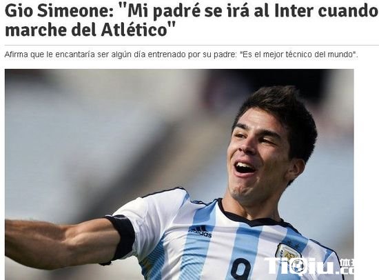 国际足球 时间:2015-01-30 15:37来源:未知编辑:小北【导读】北京时间2015年1月30日消息,阿根廷人西蒙尼在马竞的执教战绩彪炳,他帮助球队赢得过西甲、国王杯、西班牙超级杯、欧联杯和欧洲超级杯,虽然他同床单军团正处于蜜月期,但是西蒙尼仍然是不少豪门挖角的对象,大巴黎、国米、曼城甚至阿根廷国家队都曾经同其传出过绯闻,而据西班牙《世界体育报》消息,西蒙尼的儿子吉奥瓦尼透露铁帅离开马竞后的唯一选择是国际米兰。
