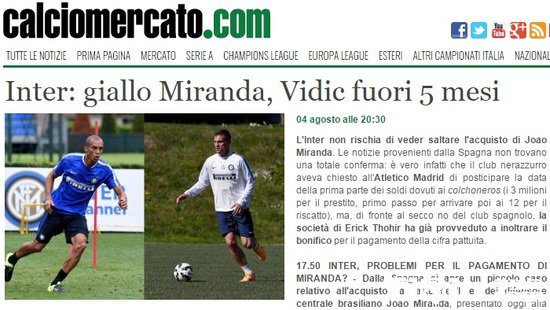 此外《足球市场》还透露,国米新援米兰达的转会出现了一点问题。根据合同,国米是花300万欧元从马竞租借米兰达两年,并且必须在两年后强制花费1200万欧元将其买断。本周国米本该向马竞支付300万欧元的租借费,但国米却请求马竞同意自己推迟付款,到今年11月才能支付这笔租借费。这让马竞俱乐部很不高兴,甚至一度威胁要取消转会合同回收米兰达,最终国米主席托希尔只得按照合同要求按时付了款。