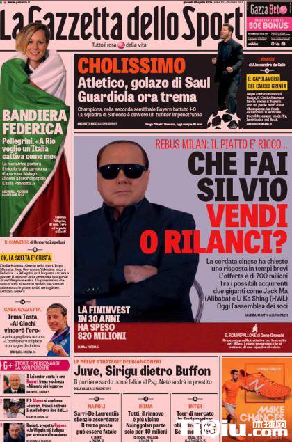 《米兰体育报》也对米兰俱乐部的出售进行了关注,据悉,来自中国的买家要求贝卢斯科尼快速的做出是否出售的决定,前意大利总理需要在下周三答复中国的投资者,而且中国方面已经对米兰俱乐部的账目进行了分析。目前米兰也在当地时间周四召开了股东大会,宣布俱乐部在2015财年一共亏损了8930万欧元,而这部分亏损额将由菲宁维斯特集团填补。