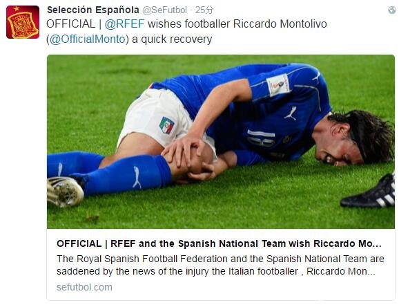 北京时间10月8日晚,西班牙国家队官方更新了推特,祝福意大利国脚蒙托利沃早日康复。