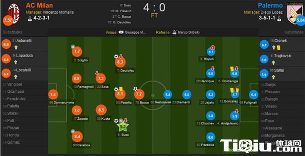 本场比赛,苏索回归,赛前各大媒体以及球迷就在期盼着苏索的表现。果然,米兰的进攻仍然在依靠苏索,一人制造3球,赛后意大利多家媒体均给了苏索最高分,《全市场》给出了7.5分,而《whoscored》给出了9.3分。