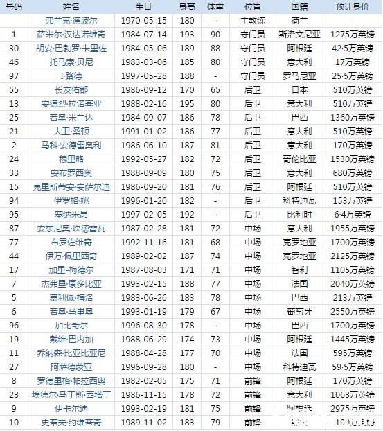 2016-2017国际米兰阵容汇总 国际米兰球员名单