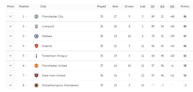 国际足球 时间:2022-05-11 10:54来源:足坛欧美汇编辑:巴伐利亚南大王本赛季英超的冠军争夺已经进入到了白热化阶段,在今天凌晨的比赛过后,利物浦在多赛一轮的情况下积分追平曼城,两队同积86分,红军以净胜球上的劣势排名第二。