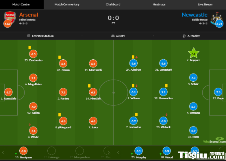 阿森纳0-0纽卡斯尔球员评分 曼联4连胜稳居前四