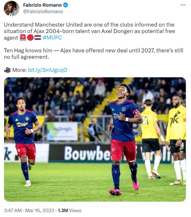 国际足球 时间:2023-03-16 14:06来源:编辑:神谷玲珑根据罗马诺的报道,曼联今夏的意向球员又多了一个名额,那就是范阿克塞尔东恩。曼联正在关注他与阿贾克斯小将的合同情况,滕哈赫特别想要这名小将。虽然阿贾克斯想要留下范阿克塞尔东恩,开出的合同续约到2017年,但是当事人并没有签协议。如果范阿克塞尔东恩拒绝了合同的续签,曼联很有可能对他进行免签。