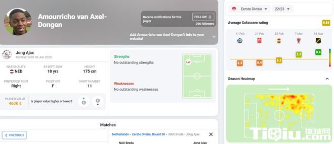 范阿克塞尔东恩在9岁时加盟了阿贾克斯青训,在2019年进入阿贾克斯U17梯队,之后实现了连年跳级,18岁的范阿克塞尔东恩已经在阿贾克斯U21崭露头角,本赛季代表预备队出战荷乙联赛首发7次、替补5次,踢了500分钟比赛打进2球送出2次助攻,总体上是一个进球效率还不错的年轻左边锋。