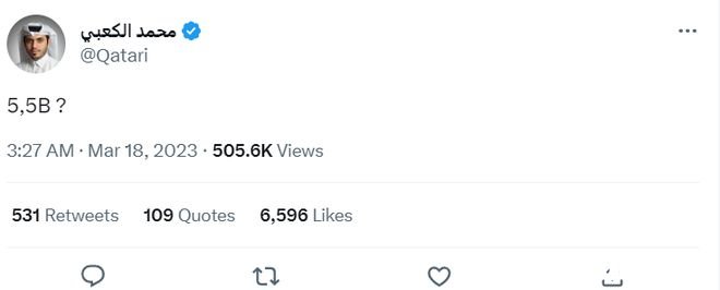 之前多次跟进曼联收购报道的卡塔尔记者再次更新了社媒,这一次他表示55亿英镑?之前,他对于曼联的收购信心满满,曾经表示3月底见分晓。之前的权威媒体报道中,认为卡塔尔财团的出价已经达到了50亿英镑,这一次现场考察之后,毫无疑问卡塔尔财团将会提高报价了。