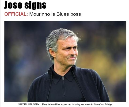 北京时间5月30日早晨,来自英媒《太阳报》头条消息宣布,穆里尼奥已经于英国当地时间本周二的晚上,与切尔西俱乐部签下了一份为期4年,合同总额达到了4000万英镑的合同!虽然切尔西官网尚未正式宣布穆里尼奥的上任,但是《太阳报》通过今天早上的头条新闻提前宣布,穆里尼奥实际上已经成为了切尔西俱乐部的新任主帅。