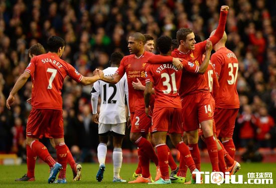 国际足球 时间:2014-02-24 10:53来源:http://gjzq.tiqiu.com编辑:小伍哥【导读】北京时间2月23日晚21点30分,2013-14赛季英超第27轮一场比赛在安菲尔德球场打响,坐镇主场的利物浦4-3险胜斯旺西。斯图里奇、亨德森、博尼各进2球,红军旧将谢尔维也有1球入账。由于热刺意外失利,利物浦牢牢占据第四位置,紧追第一集团。